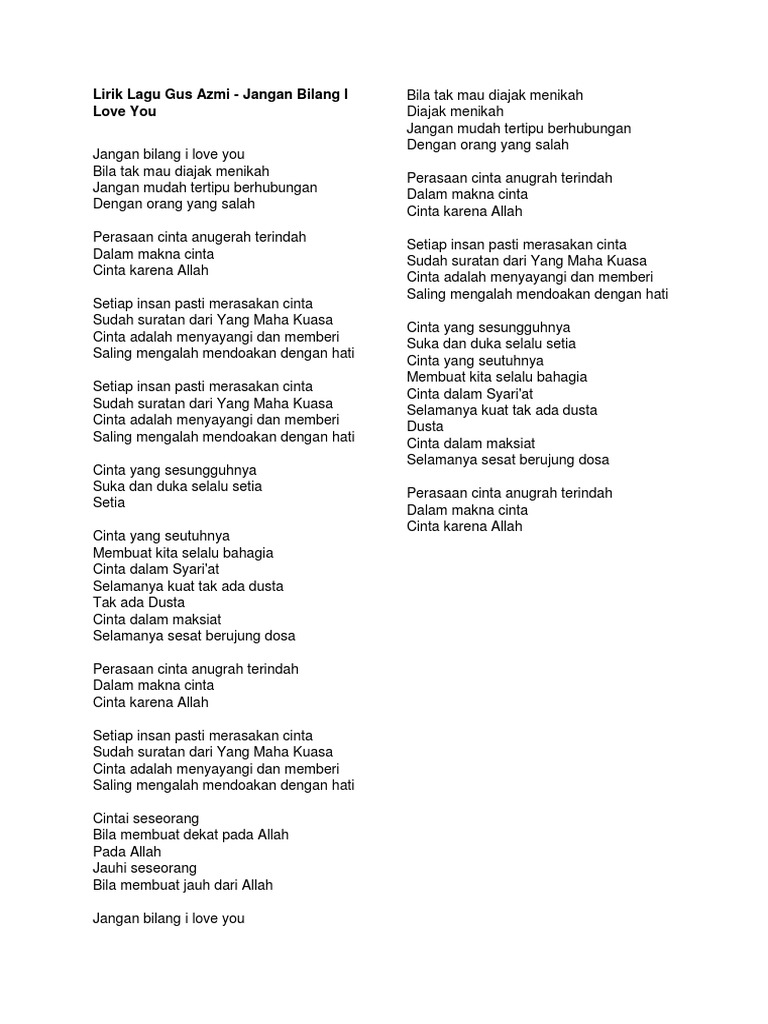 Dalam acara maulid peringatan ulang tahun Syubbanul Muslimin ada sebuah event sholawat yang megah. Hanya post ulangLirikJangan bilang I Love YouBila tak mau diajak menikahJangan mudah tertipu berhubungan dengan orang yang salahPerasaan cinta anugrah terind. Berikut cuplikan syair nyanyian teks dari lagunya.